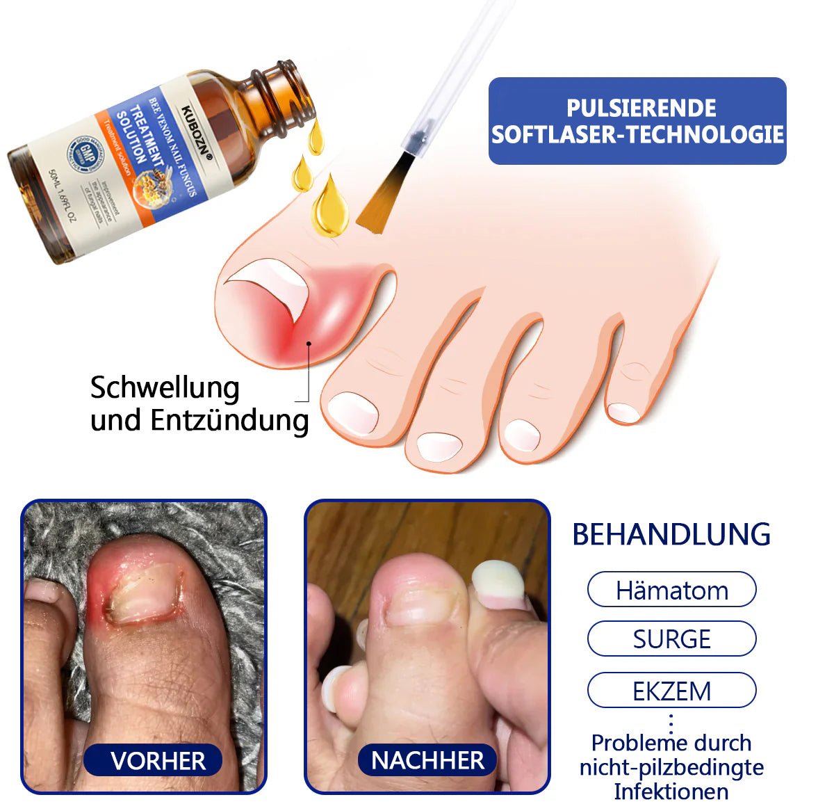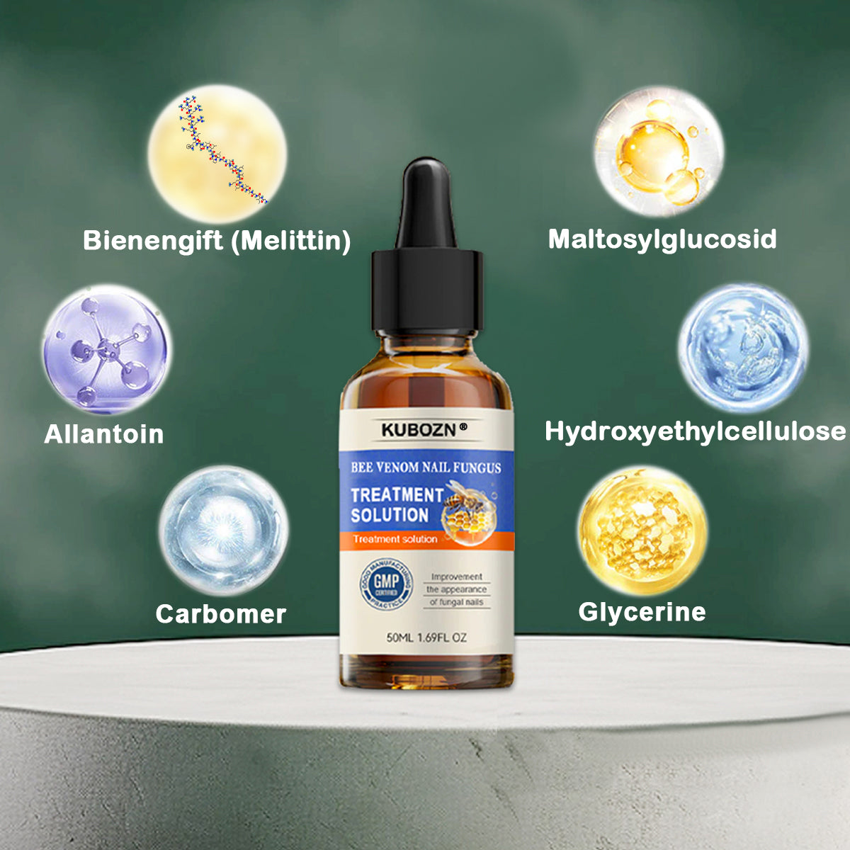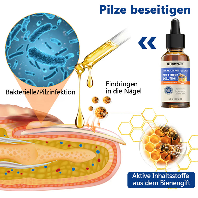 KUBOZN® nutzt Bienengift mit dieser hochwirksamen Verbindung und kombiniert es mit natürlichen Pflanzenextrakten, um tief in Nägel und Nagelhaut einzudringen. Es beseitigt Pilzinfektionen, fördert das Nagelwachstum und verhindert eine erneute Infektion.